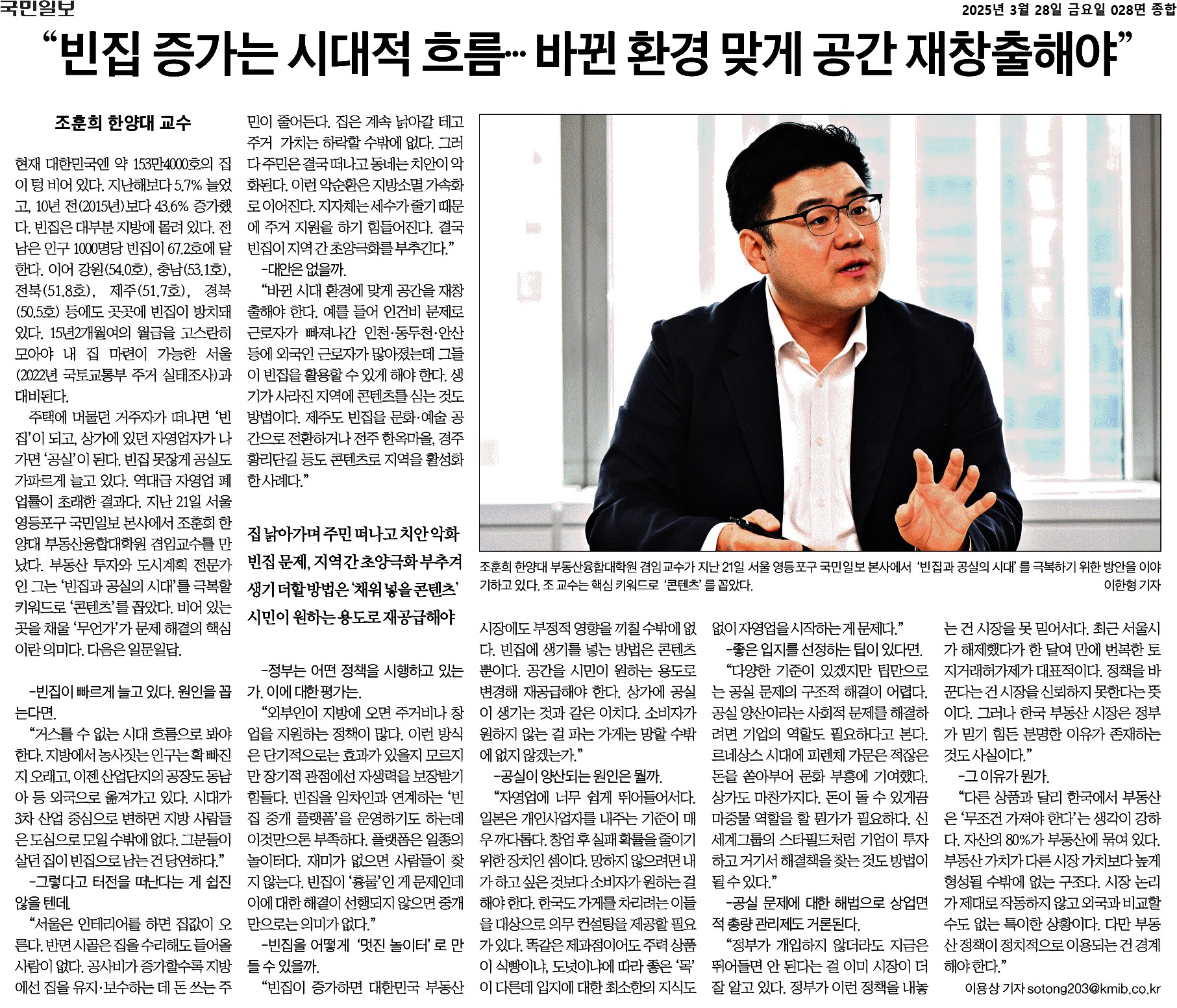 주택에 머물던 거주자가 떠나면 ‘빈집’이 되고, 상가에 있던 자영업자가 나가면 ‘공실’이 된다. 빈집 못잖게 공실도 가파르게 늘고 있다. 역대급 자영업 폐업률이 초래한 결과다. 지난 21일 서울 영등포구 국민일보 본사에서 조훈희 한양대 부동산융합대학원 겸임교수를 만났다. 부동산 투자와 도시계획 전문가인 그는 ‘빈집과 공실의 시대’를 극복할 키워드로 ‘콘텐츠’를 꼽았다. 비어 있는 곳을 채울 ‘무언가’가 문제 해결의 핵심이란 의미다. 다음은 일문일답.